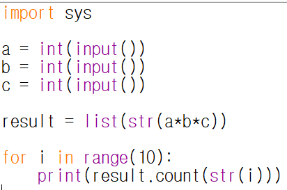 첫째 줄에 A, 둘째 줄에 B, 셋째 줄에 C가 주어진다. A, B, C는 모두 100보다 크거나 같고, 1,000보다 작은 자연수이다.
