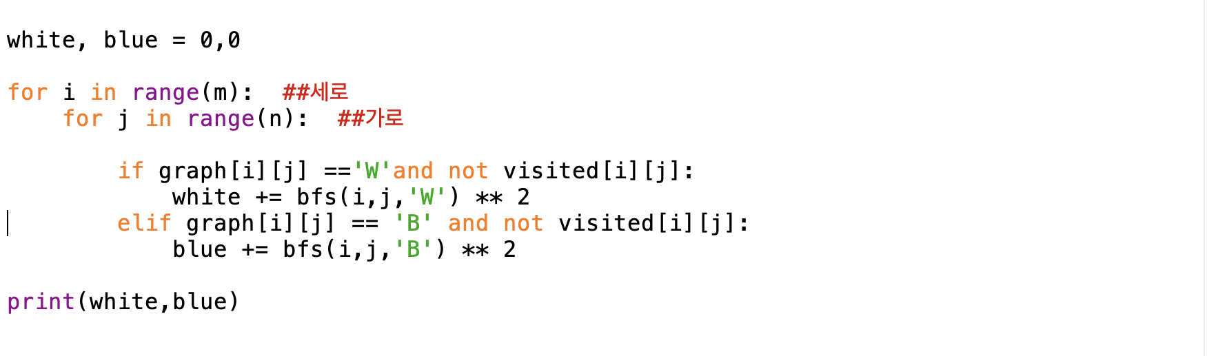 첫째 줄에는 전쟁터의 가로 크기 N, 세로 크기 M(1 ≤ N, M ≤ 100)이 주어진다. 그 다음 두 번째 줄에서 M+1번째 줄에는 각각 (X, Y)에 있는 병사들의 옷색이 띄어쓰기 없이 주어진다. 모든 자리에는